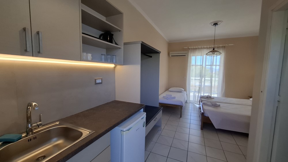 21 στούντιο με θέα την πισίνα, 1 superior διαμέρισμα και 2 οικογενειακά διαμερίσματα με μεγάλα μπαλκόνια υπό σκιά, πλήρως επιπλωμένα και με θέα την πισίνα περιμένουν τους επισκέπτες που αναζητούν ξεκούραση και απόλαυση στις διακοπές τους. Όλα τα δωμάτια είναι εξοπλισμένα με κρεβάτια με στρώματα queen size, κουζινάκι με ψυγείο και τον απαραίτητο εξοπλισμό, κλιματισμό, χρηματοκιβώτιο, μπάνιο με ντουζιέρα και ασύρματη πρόσβαση στο διαδίκτυο (WiFi).